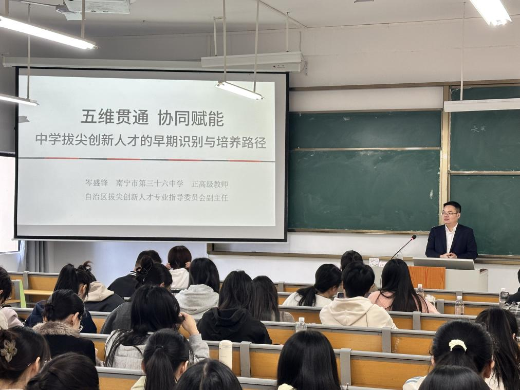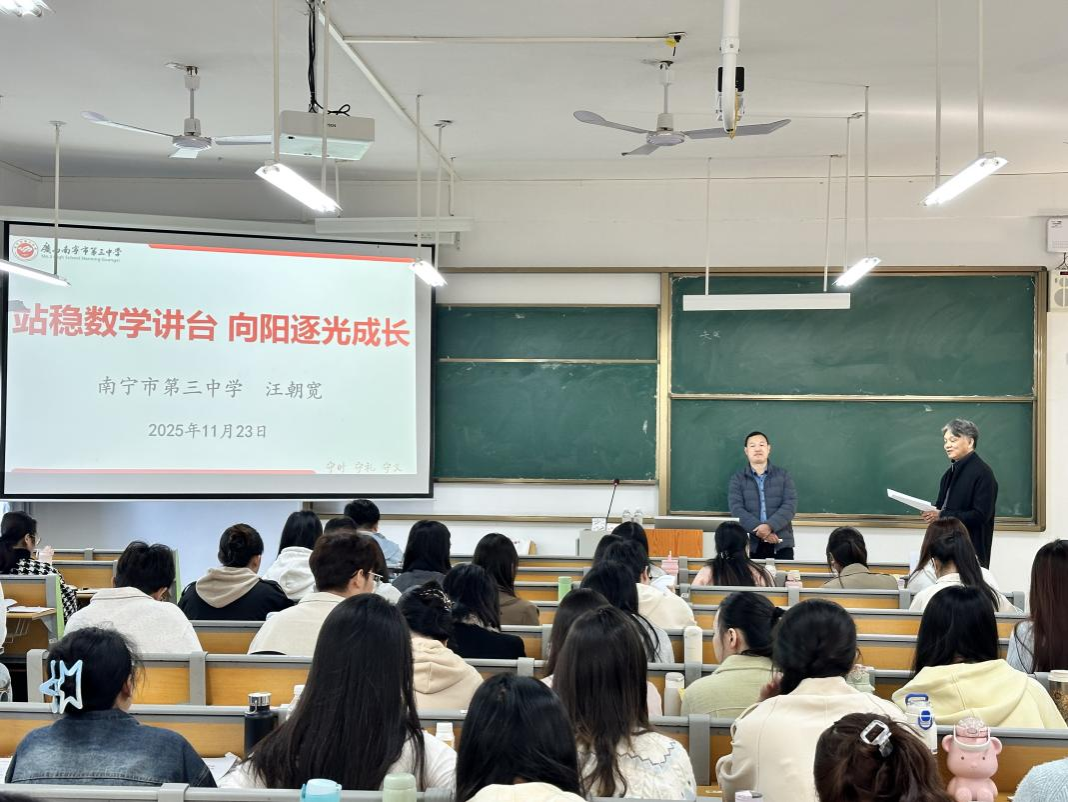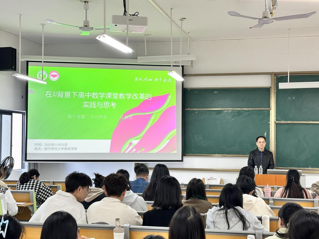 同时,来自南宁三中、十四中、二十六中、三十三中、天桃实验学校的五位校外硕导,为研究生做了精彩的报告,内容涉及中学教学改革、践行教育家精神、拔尖人才培养等,为学生提供了数学教学改革研究的方法,点亮了研究生的“数学眼光”。