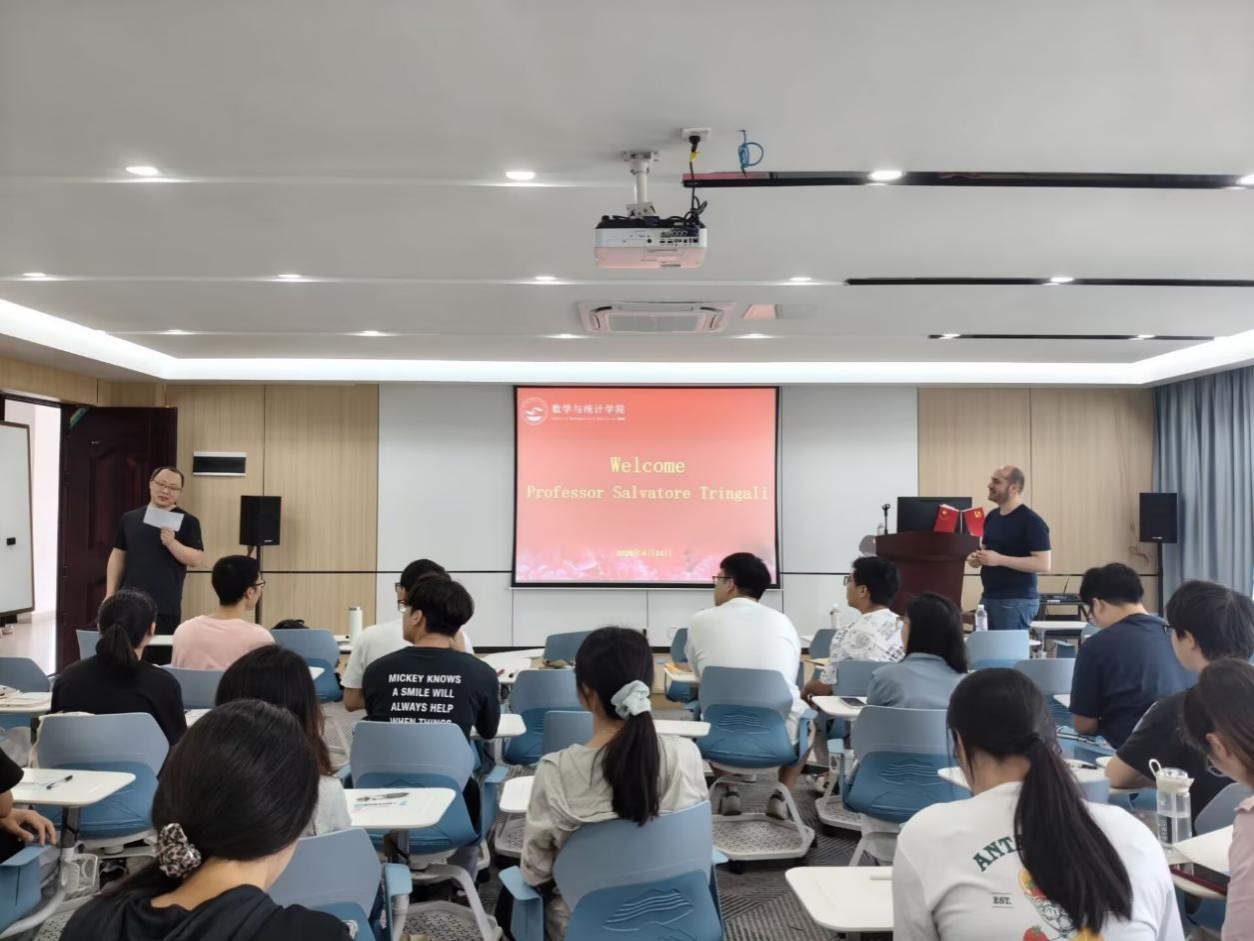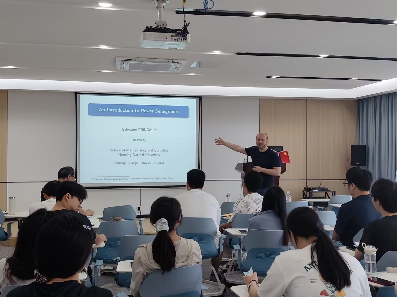 2026年4月24日至26日,应好看视频 邀请,河北师范大学Salvatore Tringali教授应邀为全院师生作题为“An Introduction to Power Semigroups”的全英文系列学术报告。本次活动由赵凯文老师主持,学院全体学术型研究生及部分骨干教师到场参会交流。