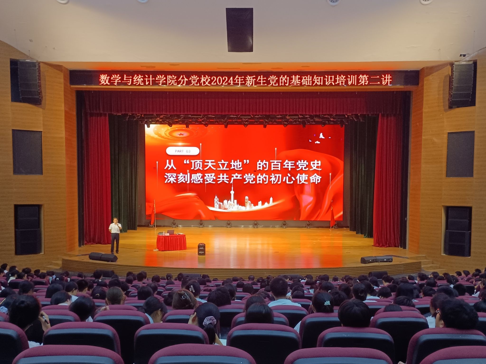 分党校于10月18日晚在武鸣校区千人演播厅开展2024级新生“党的基本知识”培训班第二讲,2024级全体新生参加此次培训,学院党委余敢才书记主讲。