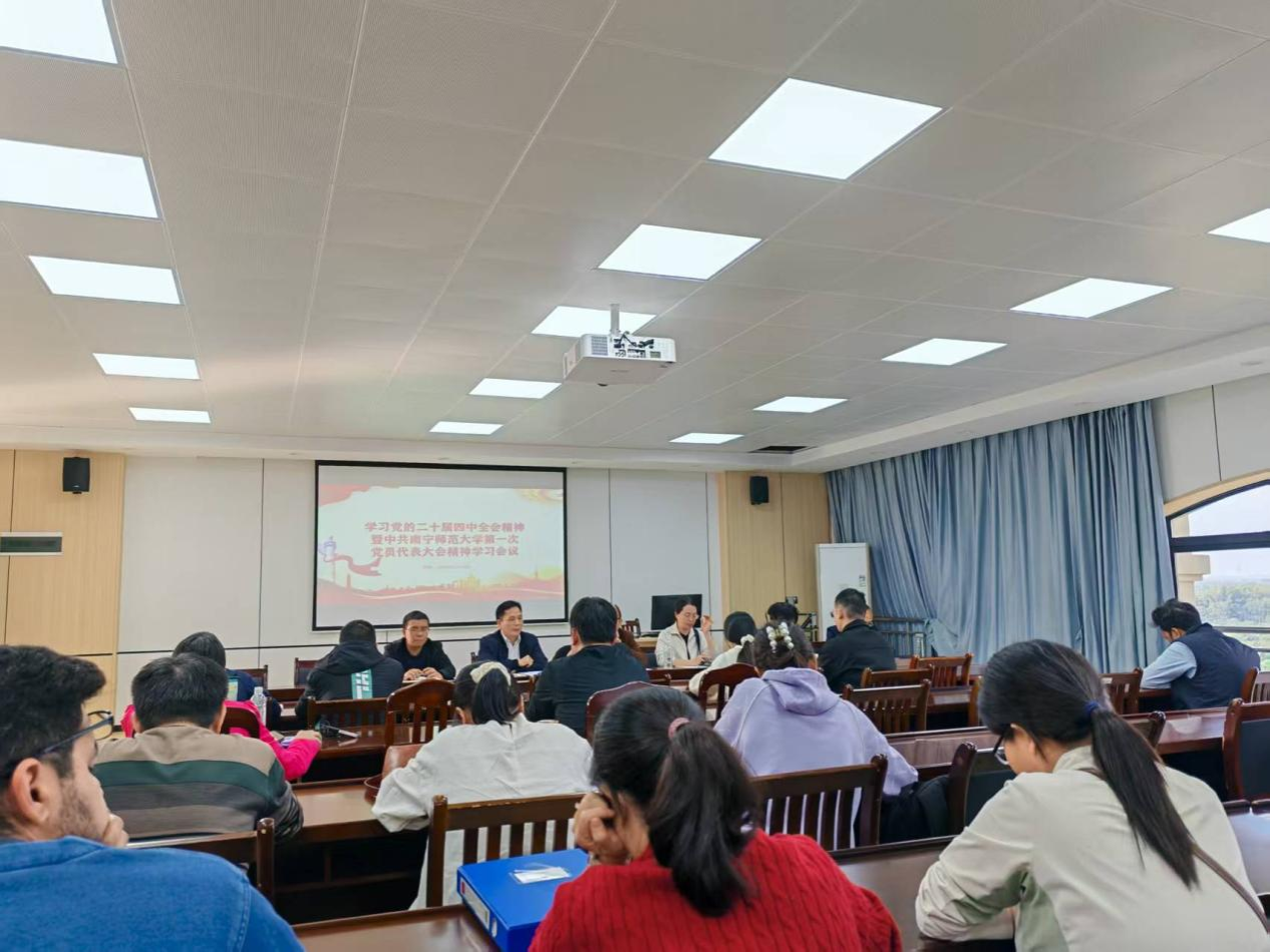 第一次党代会精神。他指出,此次党代会是在全面贯彻党的二十大和二十届四中全会精神、深入贯彻落实习近平总书记关于广西工作重要论述、全校师生聚力建设高水平师范大学的关键时期召开的一次重要会议。会议总结了学校上次党代会以来取得的成绩,深刻分析了世界面临新变局、教育面临新布局、广西面临新格局、学校面临新开局,明确提出“1395总体发展战略”,并把其作为未来五年乃至更长时期学校事业改革发展的基本遵循。他希望全体教职工以党的二十届四中全会精神为指导,紧紧围绕学校党委制定的“1395总体发展战略”,结合学院实际,凝心聚力、扎实推动学院的高质量发展。