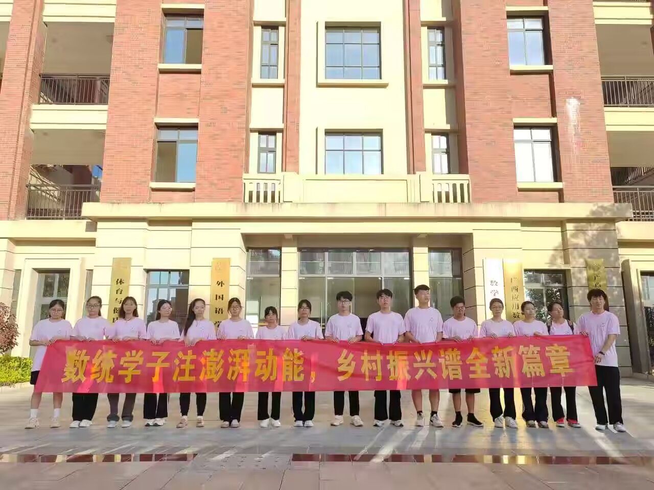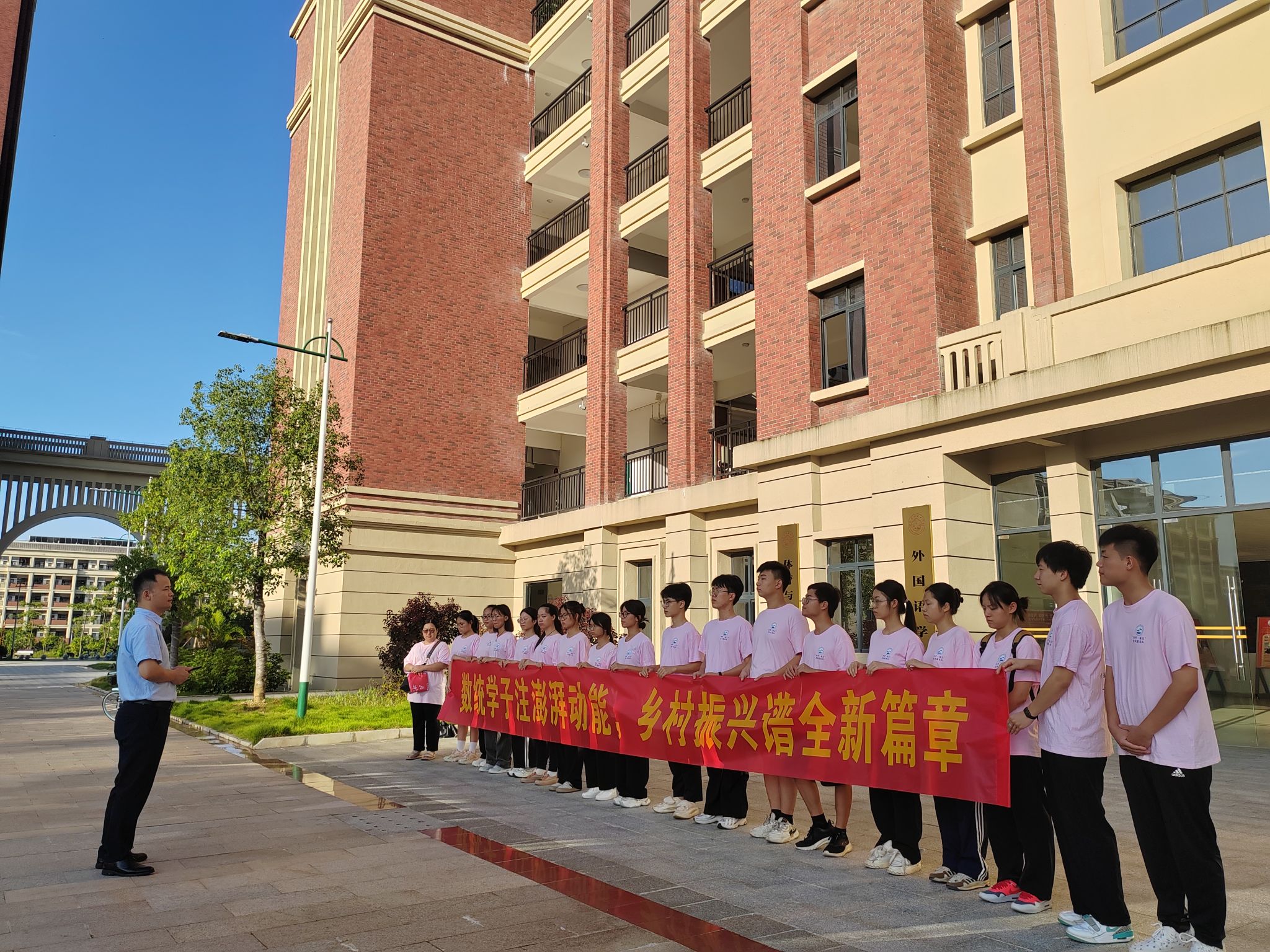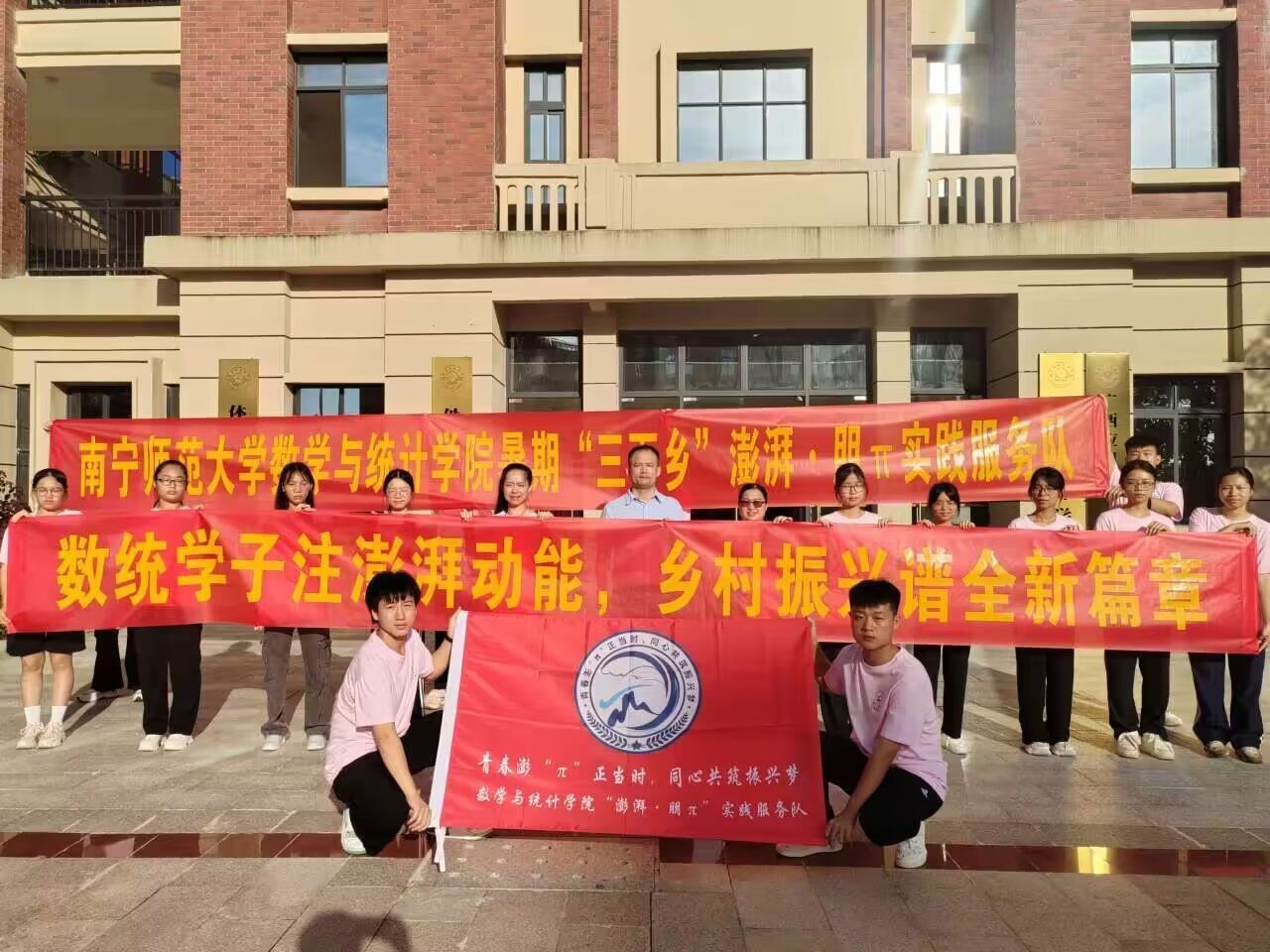 在数统楼前举行了大学生暑期“三下乡”社会实践活动出征仪式。该院党委付进副书记、带队辅导员梁卡霖老师和“澎湃·朋π”实践服务队全体队员参加仪式。