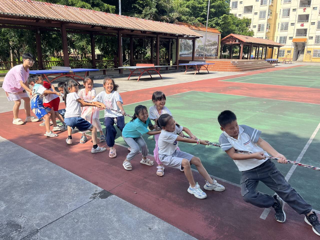运动会现场热闹非凡,气氛热烈,随着裁判员的一声哨响,背夹气球比赛率先拉开帷幕,考验了参赛小朋友们之间的默契与协作能力。紧接着,拔河比赛更是体现了团结的力量,展现出队员们勇于拼搏的精神,赢得了在场观众的阵阵掌声。在绕杆跑中,队员们你争我赶,奋勇争先,把比赛推向高潮。最后,实践服务队特别为小朋友们精心筹备了数字默写、扑克连连看和数学投壶等趣味游园活动,让队员们在欢声笑语中感受了数学的魅力。