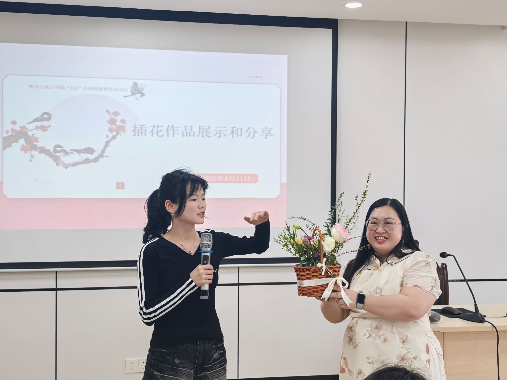 心理健康工作站于4月11日在数统楼A601会议室举办了“花语心晴,绽放美好”插花活动。学院团委梁卡霖书记、辅导员张硕老师及学院学生代表参加了此次活动。