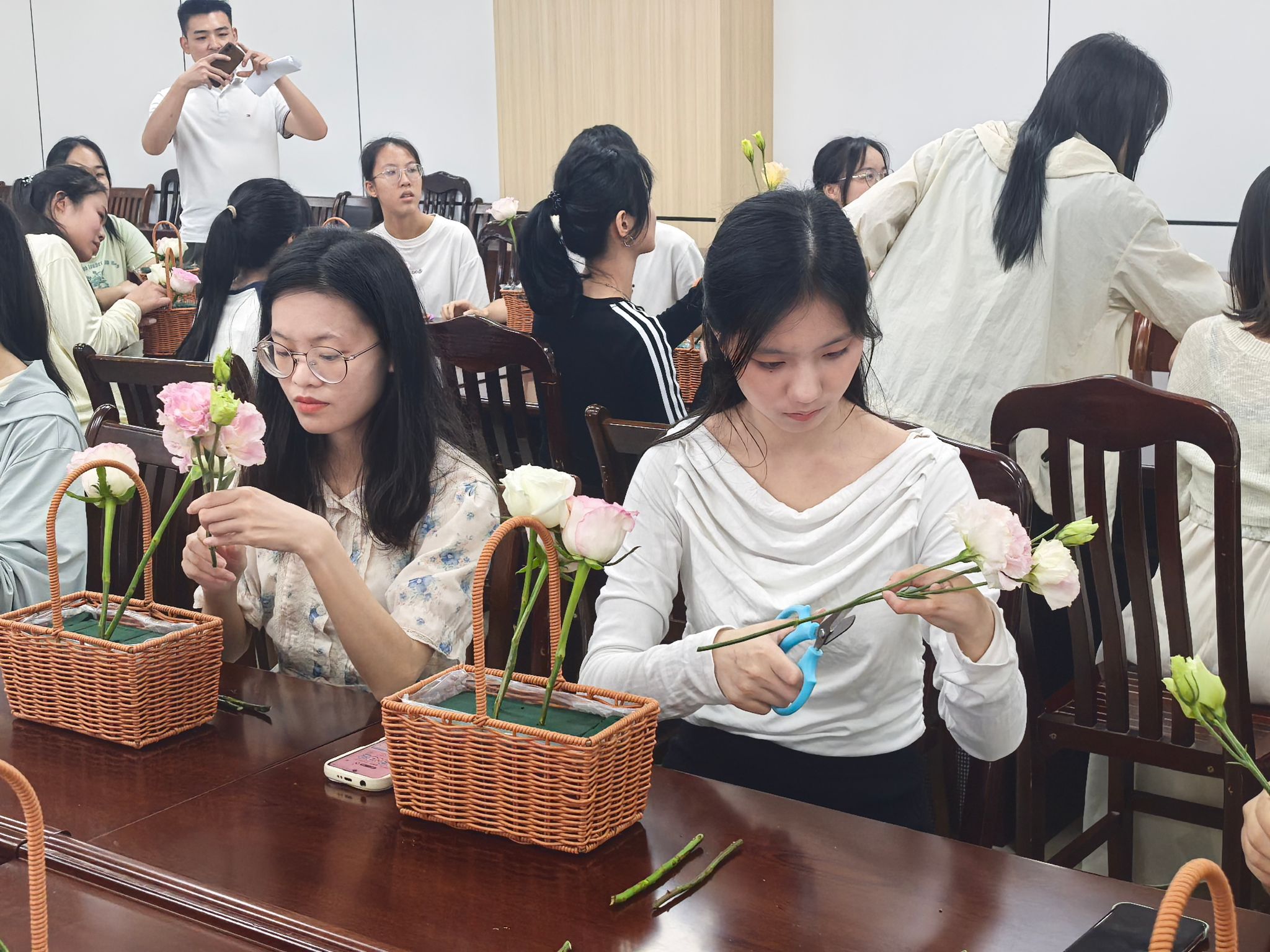活动伊始,梁卡霖书记围绕插花艺术的历史与发展及不同花材的寓意和搭配技巧等方面进行讲解,教同学们“盆式插花”的方式和技巧,包括如何根据花材的高低、疏密进行搭配,并对好的作品进行赏析。在插花过程中,同学们自由创作,享受插花带来的乐趣。两位老师耐心为其讲解,结合实际情况给出建议,帮助同学们做出更加出色的作品。其中有四位同学上台展示并讲解了自己的作品,每人都有自己独特的见解。梁老师对同学们的作品进行点评,肯定大家的创意和努力,并鼓励同学们相信自己作品的独特价值,极大地增强了学生的自信心。