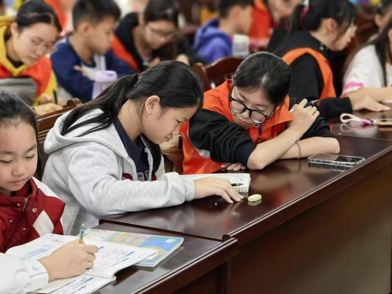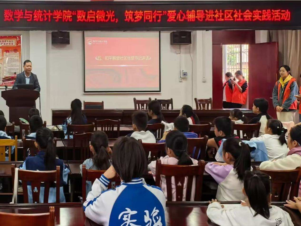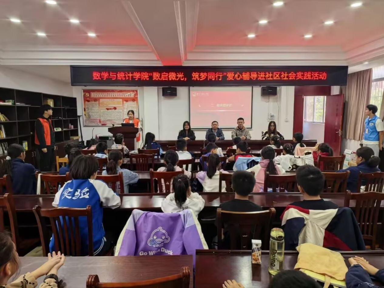 看到小朋友们的眼神中流露出对知识的渴望,脸上洋溢着愉悦而又坚定的神情,2024级数本2班的梁锦源以杨辉三角为切入点,拆解数学奇妙规律,穿插高斯、牛顿的趣味小故事,瞬间点燃小朋友们的兴趣,同时也拉开本次爱心辅导活动的帷幕。随后,张健书记结合自身经历分享经验与感受,感谢志愿者的无私付出,希望通过活动帮孩子们找到数学乐趣、提升学习信心。辅导员卢若楷老师向社区对活动的大力支持表示感谢,并鼓励志愿者珍惜实践机会,传承前三期爱心辅导活动的优良传统,以实际行动践行“德才并育,知行合一”的校训,传递数学的知识与魅力。学生党建常务封艾利为志愿者送上贴心建议,同时感谢社区搭建实践平台。仪式尾声,全体人员拍摄温馨合影。随后志愿者们与小朋友们一对一结对,开展耐心答疑与细致辅导。