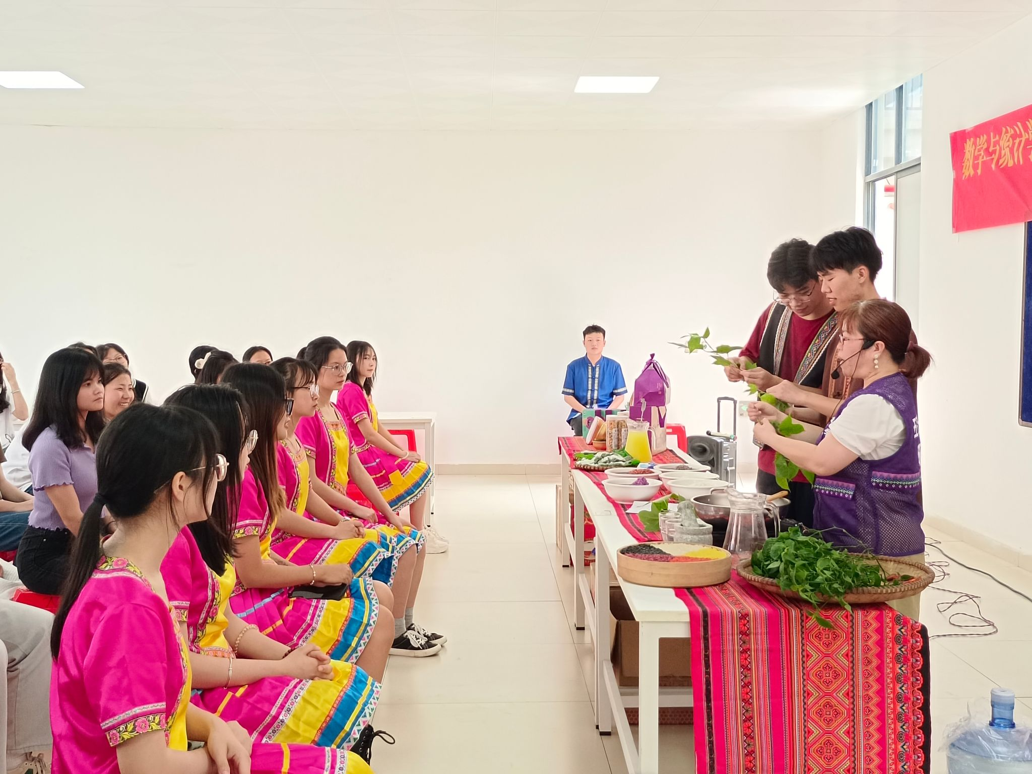武鸣五彩壮乡壮族五色糯米饭制作技艺传承人潘红华开展了壮族五色糯米饭制作技艺传承与创新之探索的讲座。她强调了五色糯米饭制作技艺的传承与创新的重要性,指出壮族五色糯米饭必须采用传统植物原料制作,工序也是采用传统技艺,这样蒸煮出来的糯米饭才能亮丽色泽、饭质松软、香味独特。她希望通过此次活动让同学们直观地感受非遗美食的魅力,共同做民族文化的传承者。
