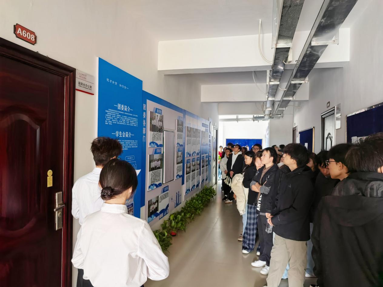 系统化、功能化的楼层空间全面展示了学院深厚的育人底蕴与卓越成果,获得了参观学生的高度评价。一楼大厅的学子风采与实习实践成果的展板是学院形象的展示窗口,更通过“深造学生风采展”、“陶行知班实习印记”以及“数润边疆”暑期社会实践成果等板块,生动记录了学子们从课堂学习到教学实践、从学科竞赛到服务社会的成长轨迹。到二、三楼配备先进设备的金融统计建模、数据科学等专业实验室,以及校企共建联合实验室,为学生提供了将理论转化为解决实际问题能力的平台。在四楼与五楼的核心科研区,学院强大的科研平台与师资力量成为焦点。在讲解员介绍到广西应用数学中心及各研究方向的前沿进展时,学生们凝神听讲,深刻感受到学院的学术竞争力。六楼的现代化的智慧教室和心理健康工作服务站,共同构建了一个“硬支撑”与“软环境”并重的育人生态。详细的学生工作文化墙和丰富的学生组织展示,全面呈现了学院“以生为本”、助力学生全面成长的全链条育人体系。