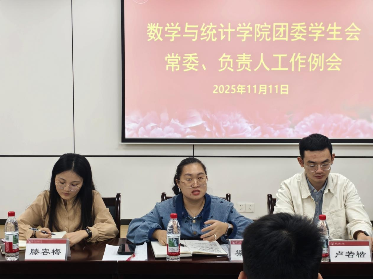 在数统楼A601会议室顺利召开2025-2026学年秋季学期团委学生会常委负责人工作例会。团委书记梁卡霖、辅导员卢若楷、滕容梅、团委学生会常委团以及各部门负责人参加了本次会议。