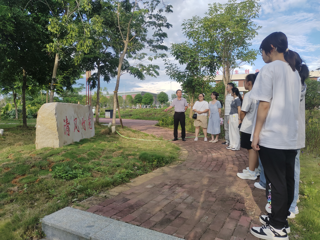 9月16日,学院党委副书记王卫彬,学院团委书记梁卡霖,辅导员卢若楷、滕容梅、方安琪带领学院学生代表参观清风竹苑廉洁文化园。参观过程中,梁卡霖老师对同学们说到:“希望大家通过学习在‘论廉、画廉、咏廉’等板块上呈现的廉洁论述,去直观感受到廉洁并非抽象概念,而是融入日常言行的坚定选择。”卢若楷老师向同学们介绍道:廉洁文化是中华优秀传统文化的重要组成部分,对青年成长至关重要,同学们应主动传承和弘扬廉洁文化,将廉洁精神内化于心,外化于行。