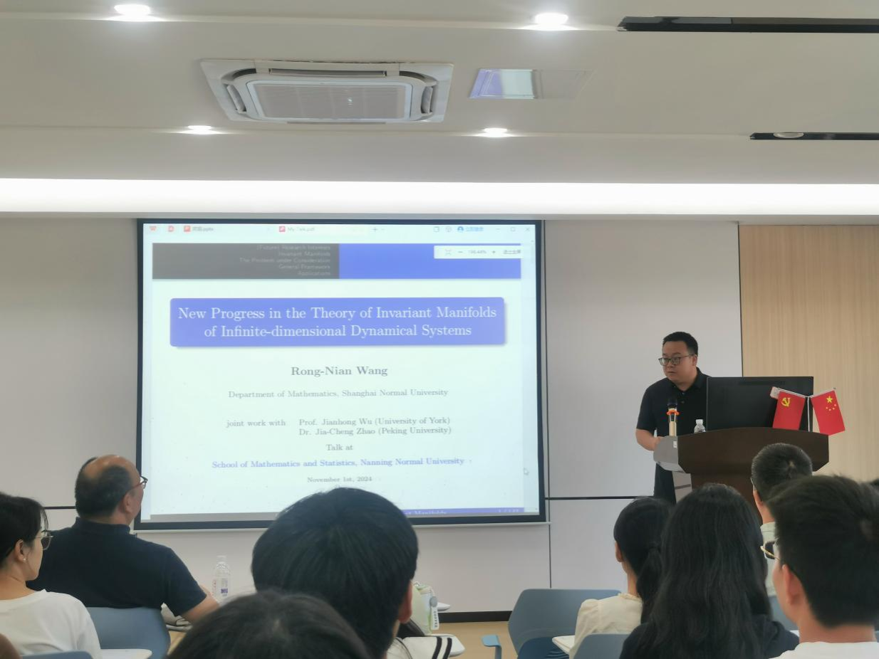 师生作了题目为《New Progress in the Theory of Invariant Manifolds of Infinite-dimensional Dynamical Systems》的学术报告,报告由院长黄在堂教授主持,部分老师及所有学术型硕士研究生参加了此次学术活动。