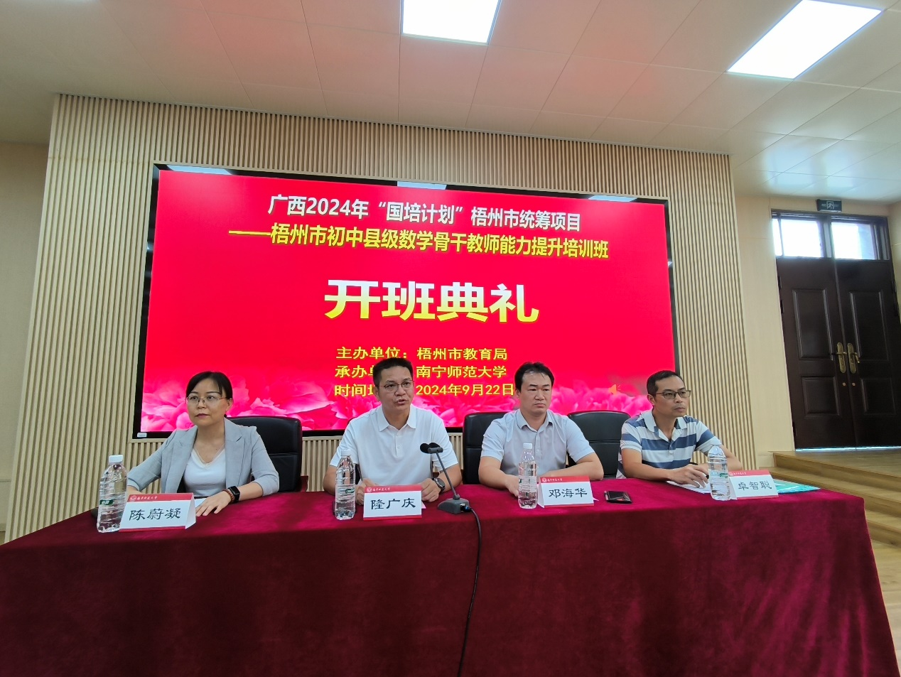 9月22日,由梧州市教育局主办、好看视频 承办的2024年“国培计划”梧州市统筹项目——梧州初中县级数学骨干教师能力提升培训班顺利开班。学校党委副书记隆广庆,梧州市教育局党组成员、副局长邓海华,梧州市教师培训中心主任卓智聪,以及来自梧州市的70位初中数学骨干参加了此次培训班开班典礼。仪式由班主任陈蔚凝老师主持。