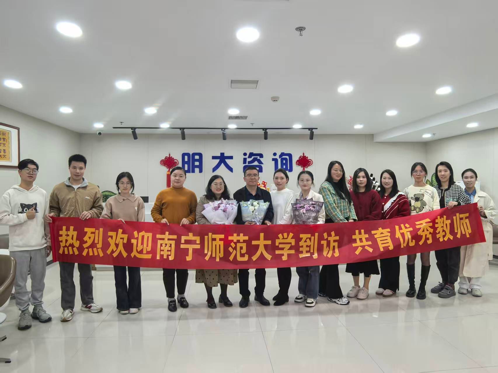为精准对接企业用人需求,助力毕业生高质量就业,10 月 23 日下午,好看视频 党委副书记王卫彬、团委书记梁卡霖、辅导员滕容梅带领毕业班学生代表,前往南宁明大教育开展访企拓岗活动。明大教育人力总监陆庆熊及南宁各校区教学主管热情接待,双方围绕校企合作、毕业生就业等议题展开深入交流。