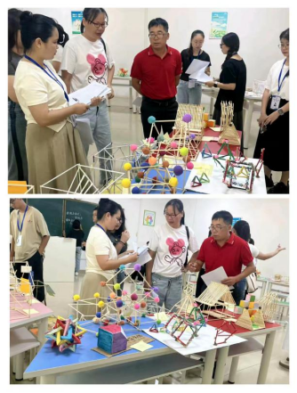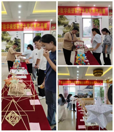 实习生将部分优秀模型在展示厅进行展示,吸引了大量学生围观讨论,数学老师也积极加入,为学生答疑解惑。
