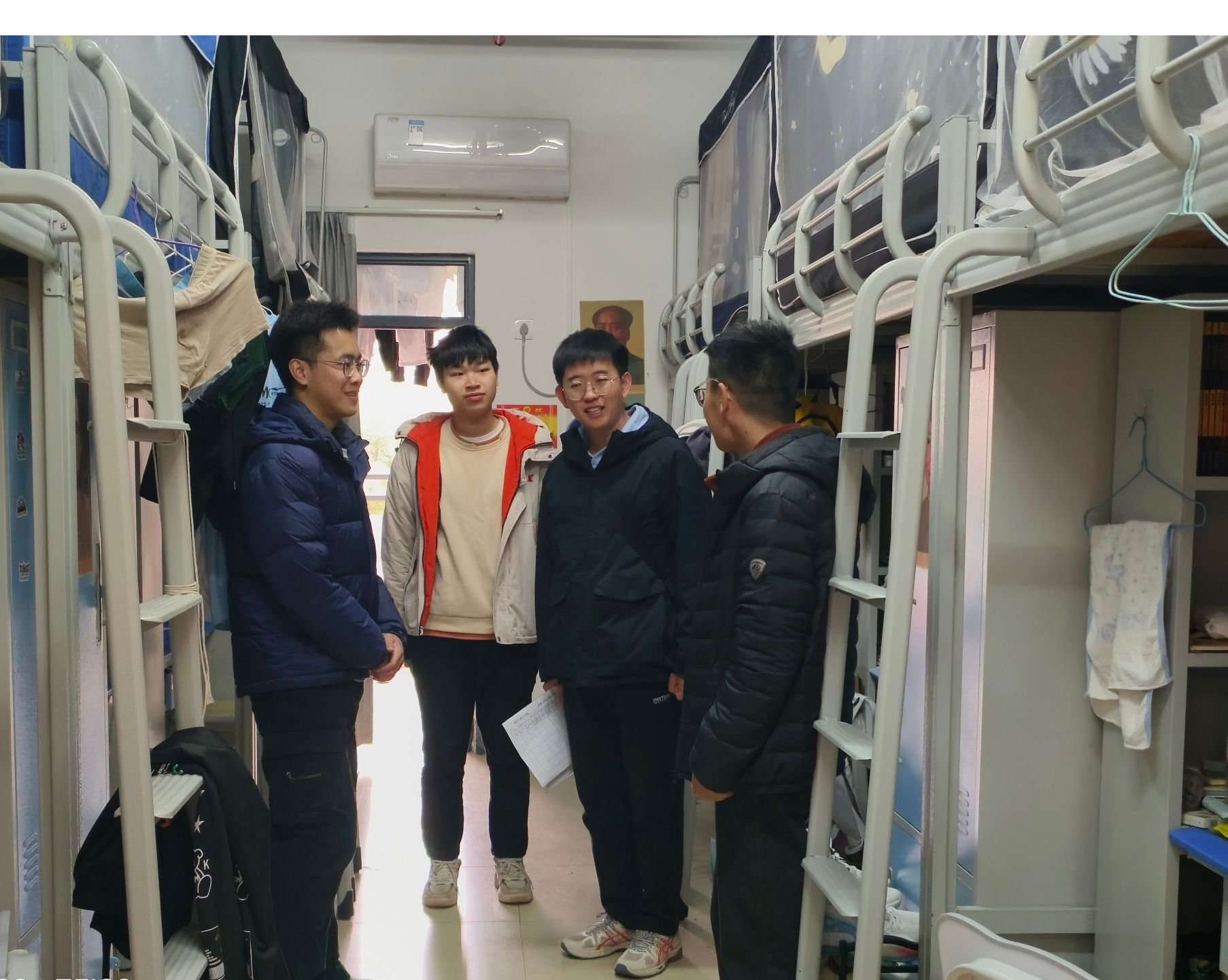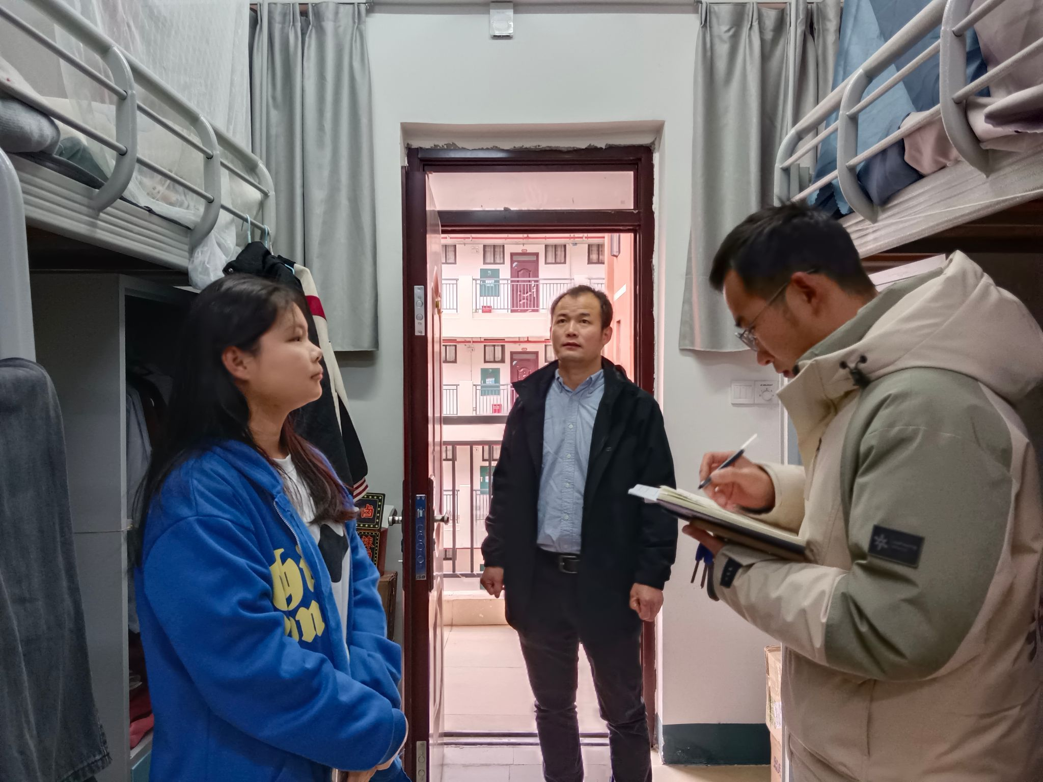 1月25日上午,付进副书记和辅导员、班主任老师带领团委学生会成员进行宿舍走访。付老师强调宿舍成员在离校前都应进行宿舍卫生大扫除,保持宿舍环境整洁并断水断电、锁好门窗,带好个人的贵重物品,按照学校规定完成全部考试后按期离校返家,到家后及时向班主任报备。老师们还对宿舍安全进行重点排查,并进行安全提醒,要求同学们利用假期时间提升自己,希望同学们度过一个安全、充实、快乐的假期。