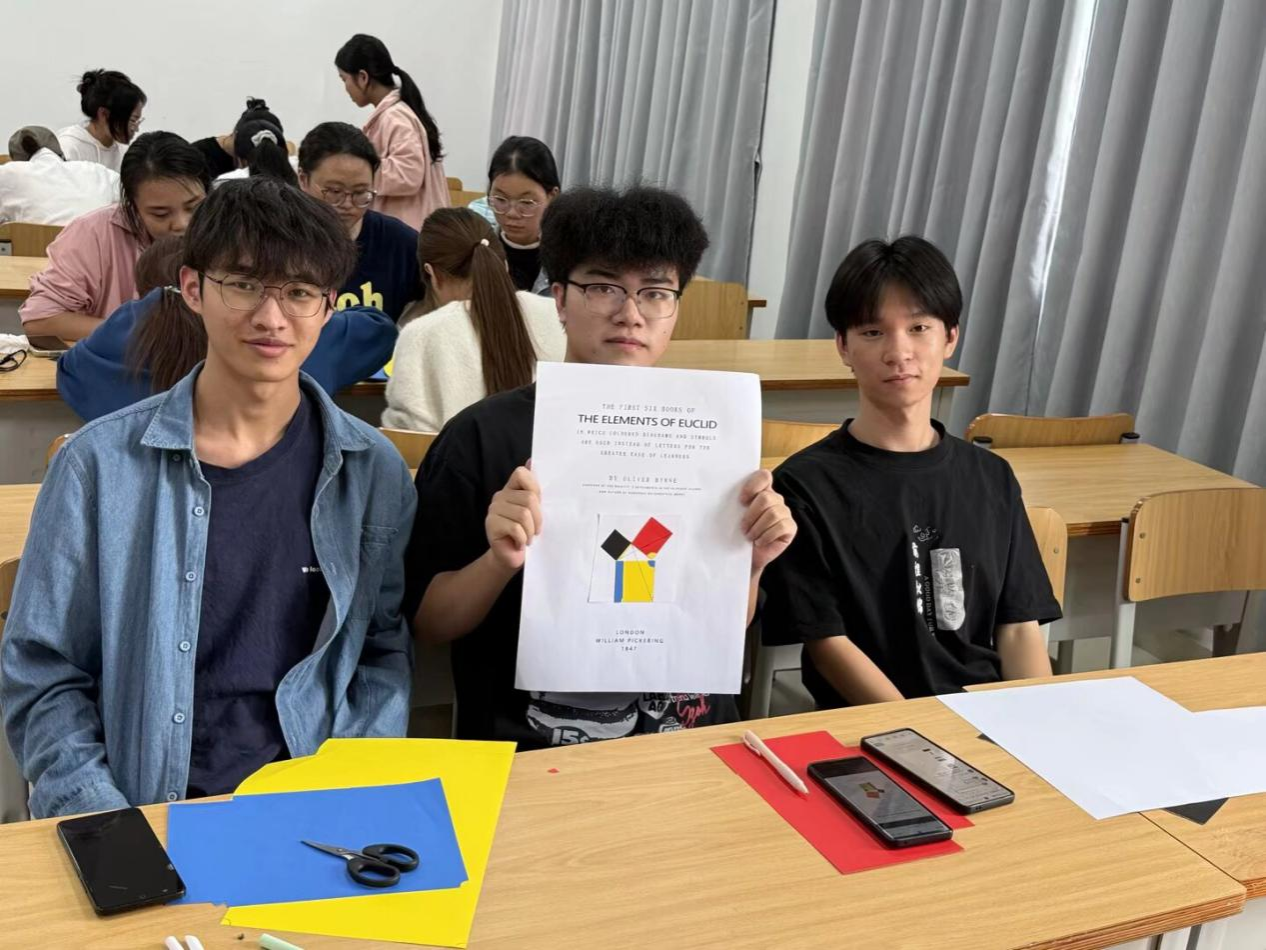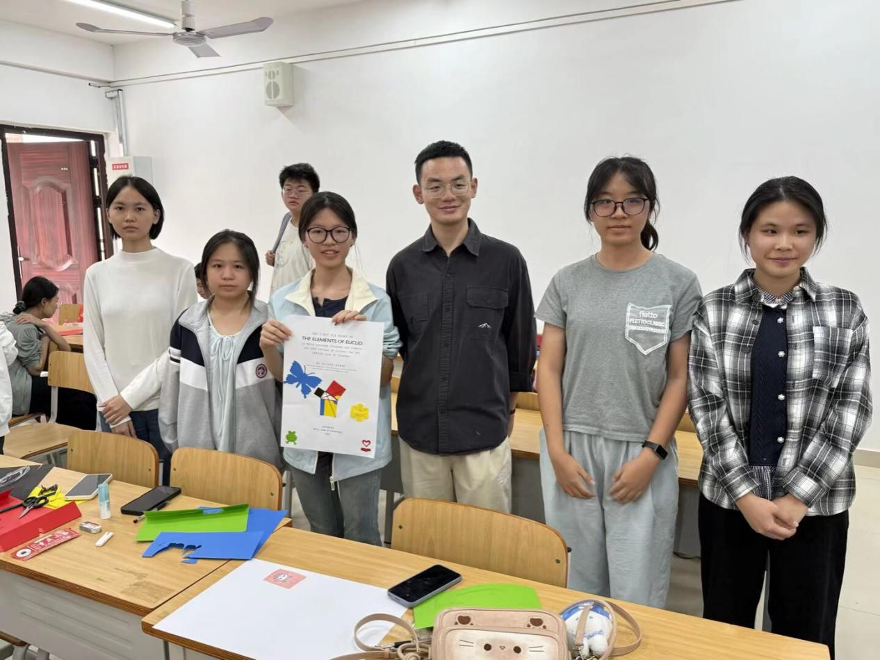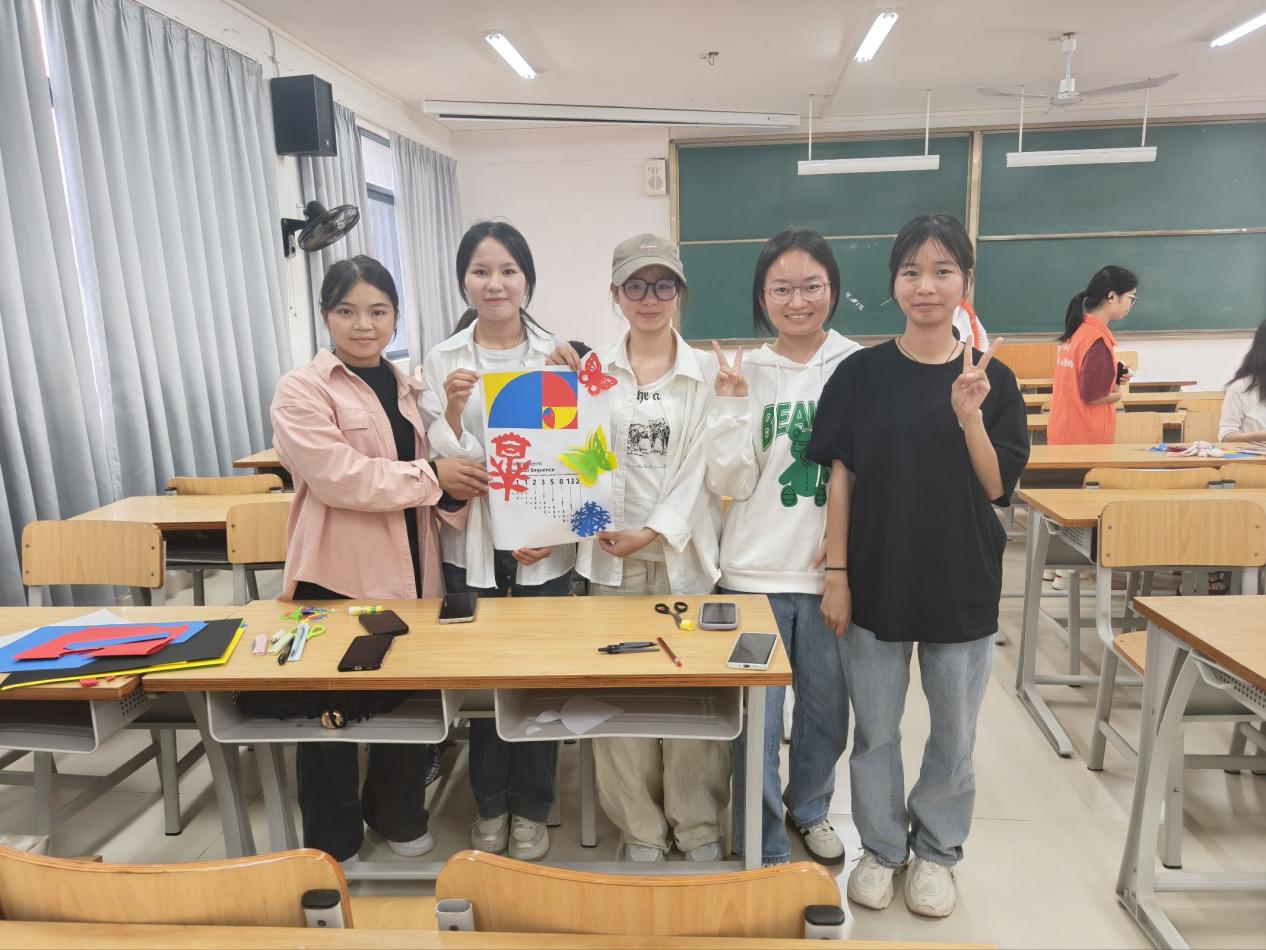 随着活动正式启动,同学们迅速投入创作。现场氛围热烈而有序,大家手持剪刀、彩纸,依据学院准备的设计稿分工协作。本次活动的设计稿由卢若楷老师设计提供,以“欧几里得的《几何原本》”、“斐波那契数列与黄金分割点” 等为核心主题,将抽象的数学概念转化为具象的剪纸图案。创作过程中,同学们不仅精准还原设计稿中的对称结构与比例关系,更不乏巧思创新——有的小组通过调整线条弧度优化黄金分割比例呈现,有的则在数列规律基础上增添创意元素,让每一件作品都兼具数理严谨性与艺术独特性。